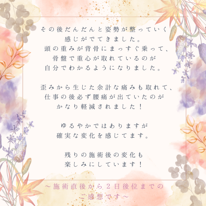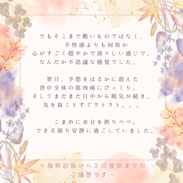 施術直後から2日後くらいまでの感想をお送りします![]()
