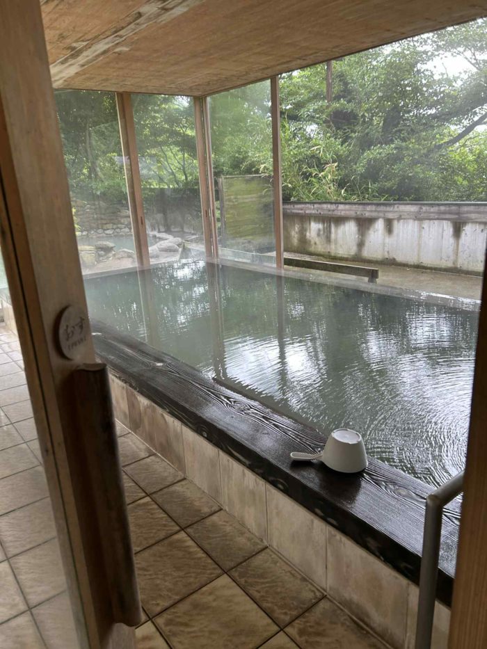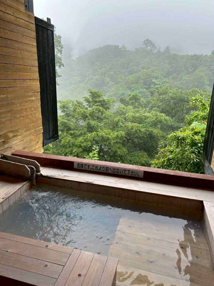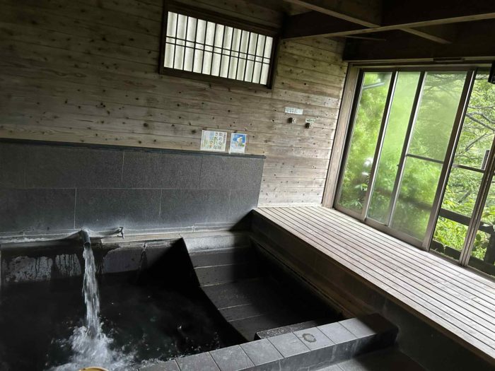 お宿は半露天風呂つき、毎回、源泉を入れ替えて入れます。